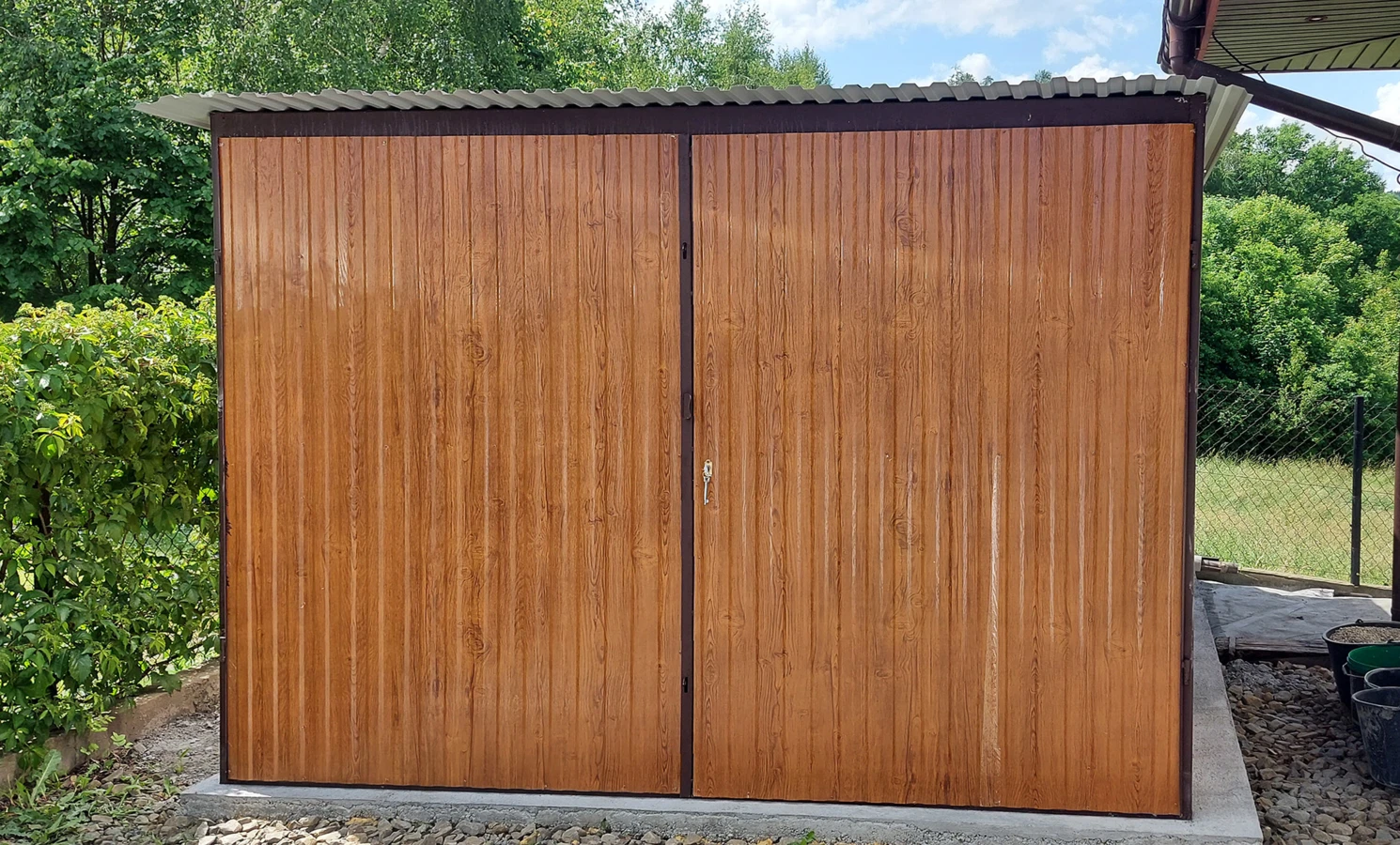 Garaż blaszany drewnopodobny 3x5, jednospadowy, brama dwuskrzydłowa, kolor złoty dąb - świetne rozwiązanie jako garaż dla samochodu lub schowek narzędziowy, a nawet jako domek ogrodowy.