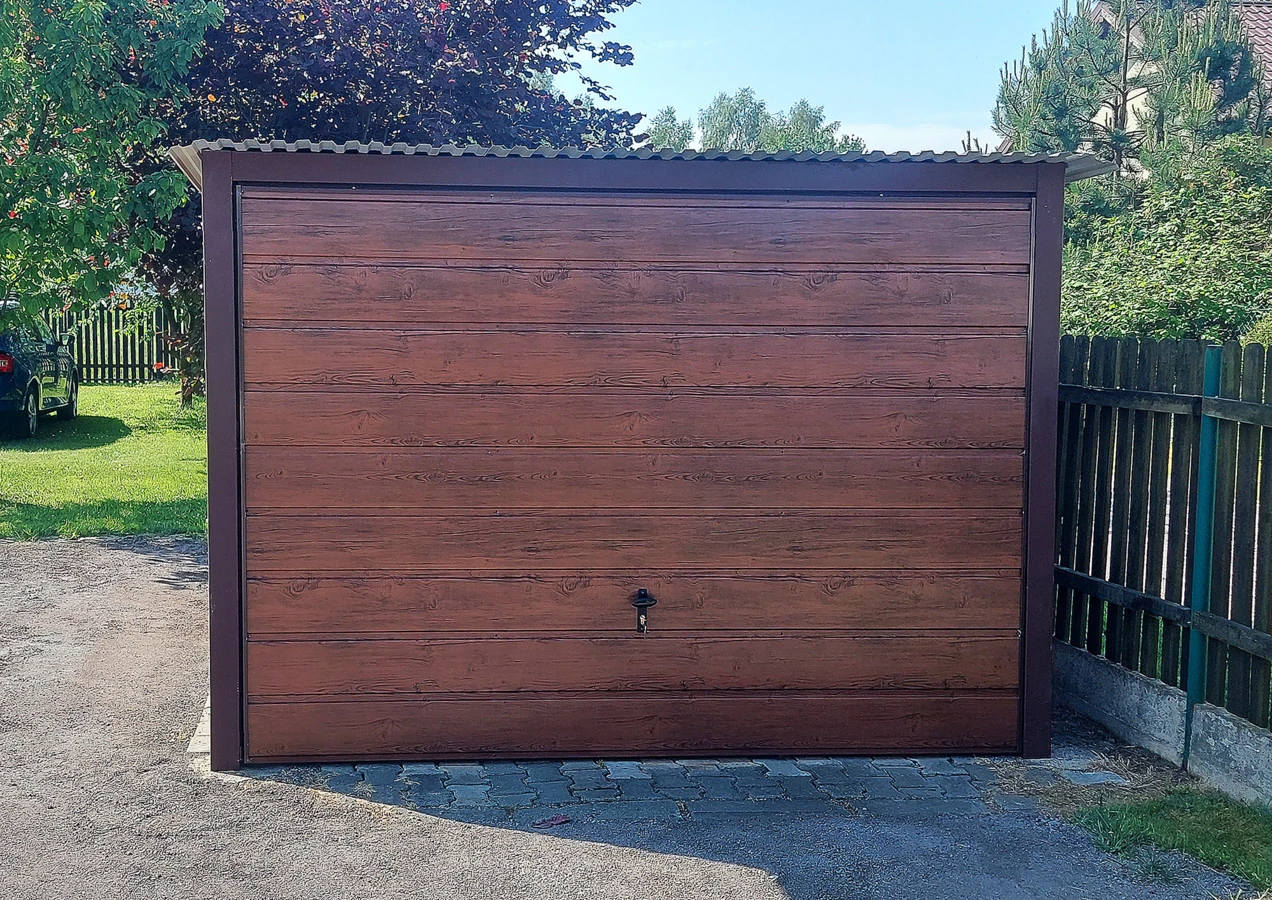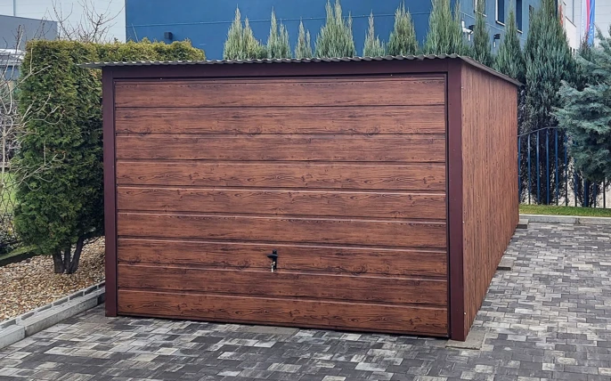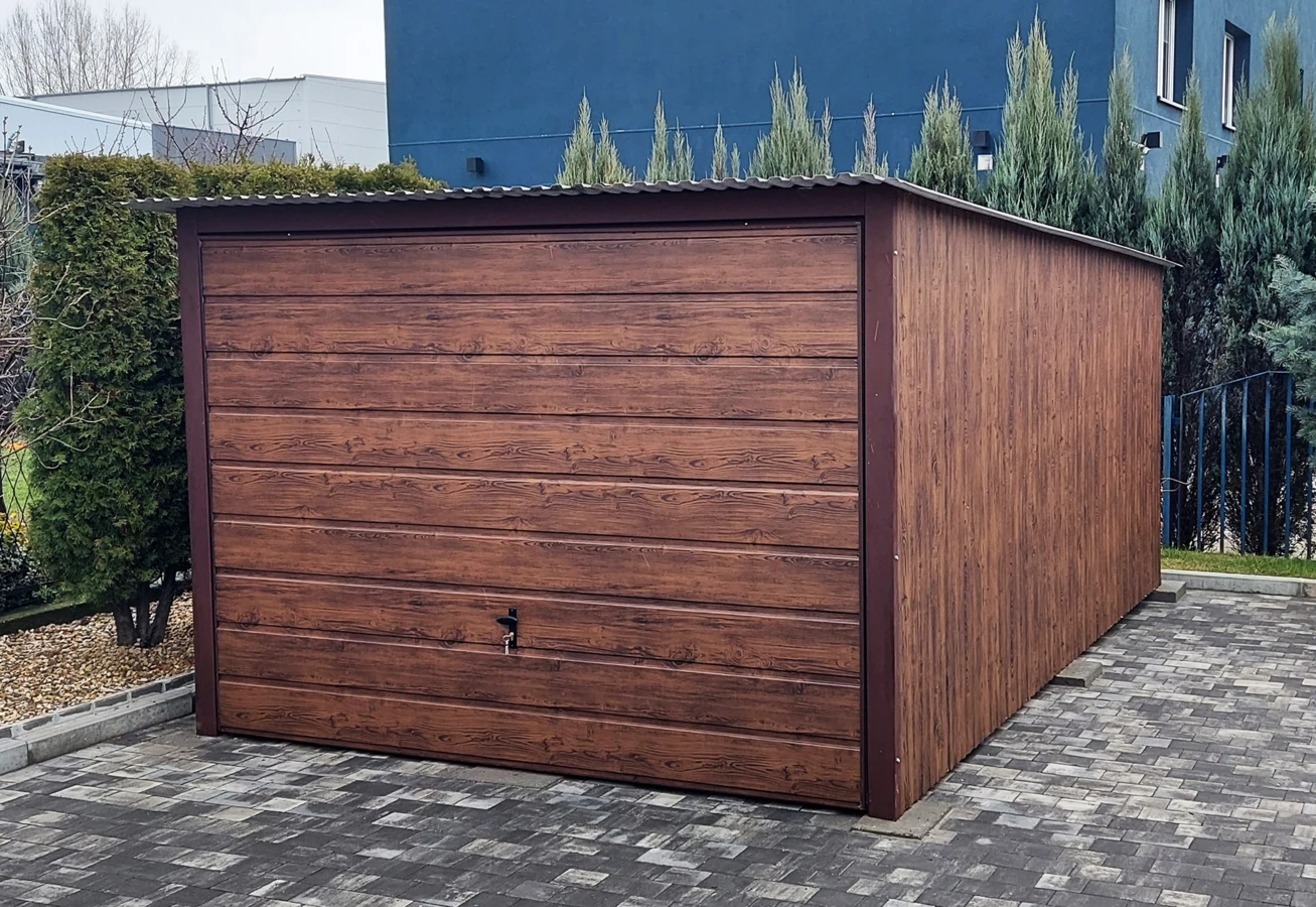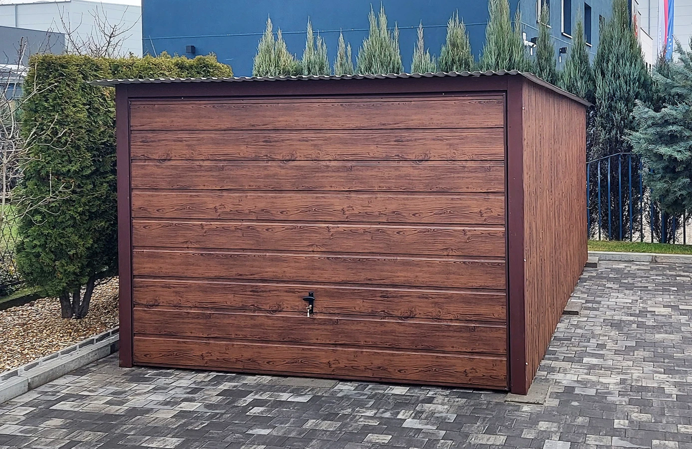 Garaż blaszany drewnopodobny 3x5, jednospadowy, brama uchylna szeroki panel, kolor orzech - świetne rozwiązanie jako garaż dla samochodu lub schowek narzędziowy, a nawet jako domek ogrodowy.