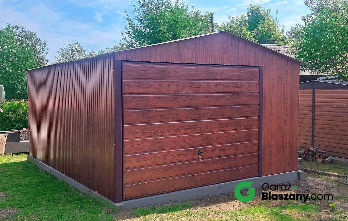 Garaż blaszany drewbnopodobny Orzech ciemny 4x5 dwuspadowy, brama uchylna, okno, furtka - świetne rozwiązanie jako garaż dla samochodu lub schowek narzędziowy, a nawet jako domek ogrodowy.