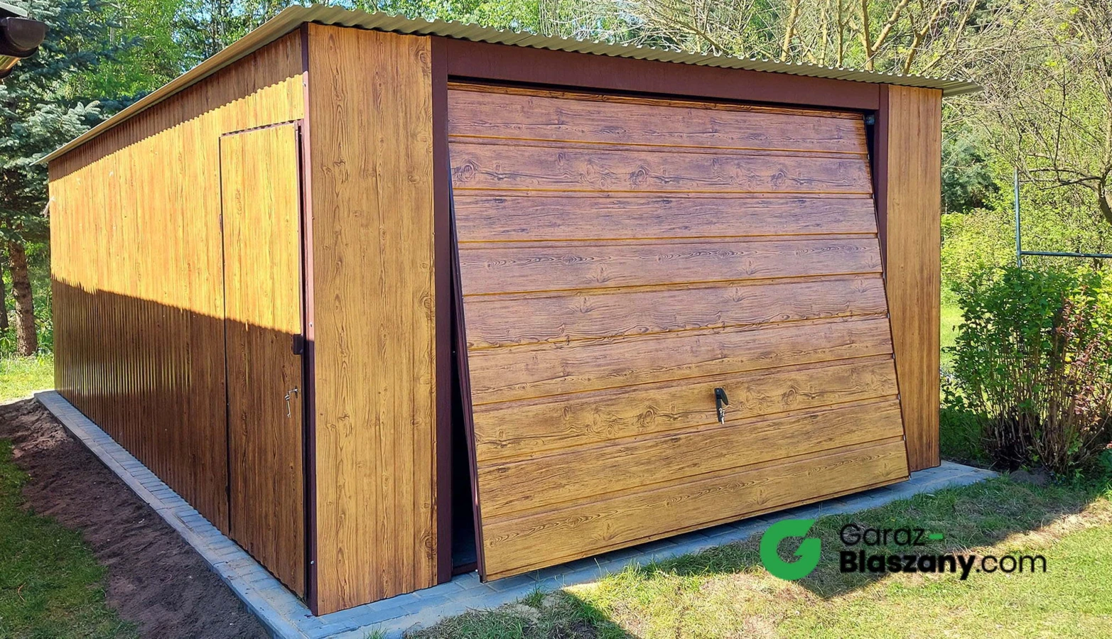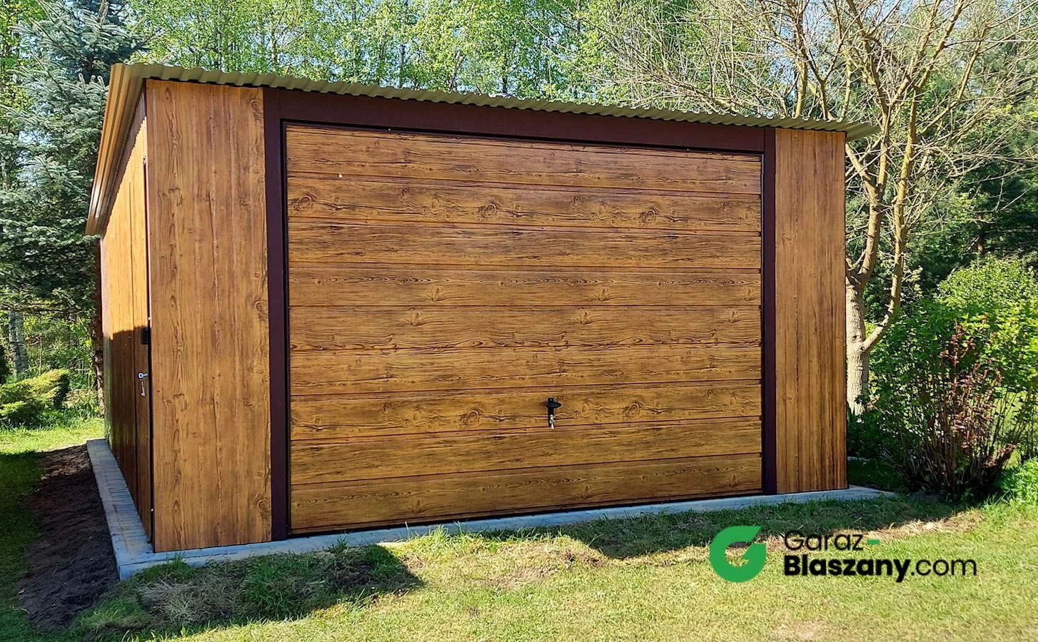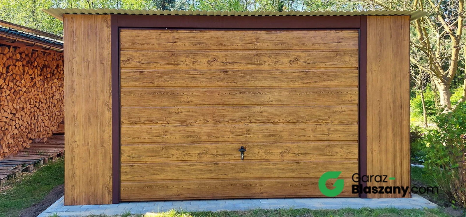 Garaż blaszany drewnopodobny Złoty Dąb 4x5 jednospadowy, brama uchylna, drzwi